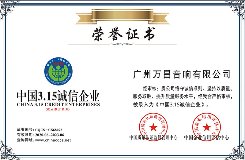 爵士龍-中國3.15誠信企業(yè)榮譽證書
